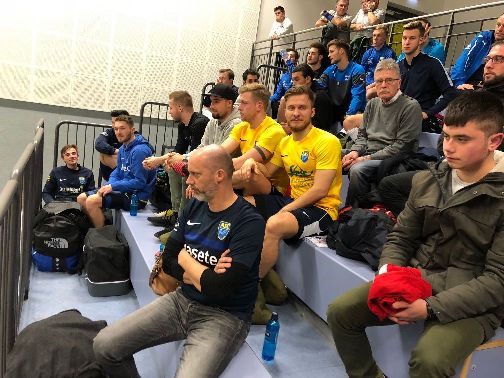 Tribünen-Dasein beim Turnier in Eppelheim: Das Hallenteam des ASC Neuenheim beobachtet die Konkurrenz im Capri-Sonne-Sportcenter und wartet auf das Viertelfinale gegen den Landesliga-Tabellennachbarn FC Türkspor Mannheim. Zuvor hatten die gelben Jungs von Trainer Alexander Stiehl (blaues ASC-Shirt) mit dem 5:2-Erfolg gegen den TSV Pfaffengrund den souveränen Gruppensieg mit 9 Punkten und 16:6 Toren abgesichert.